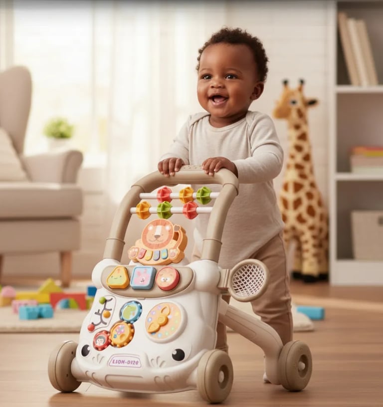 Andador interativo com teclas musicais, sons e atividades educativas.