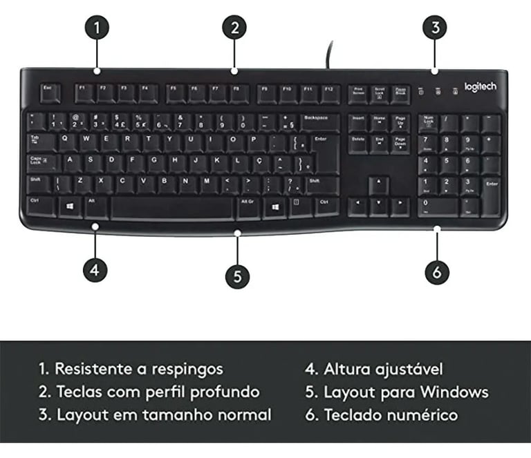 Digitação confortável, resistente a derramamentos e fácil de usar.